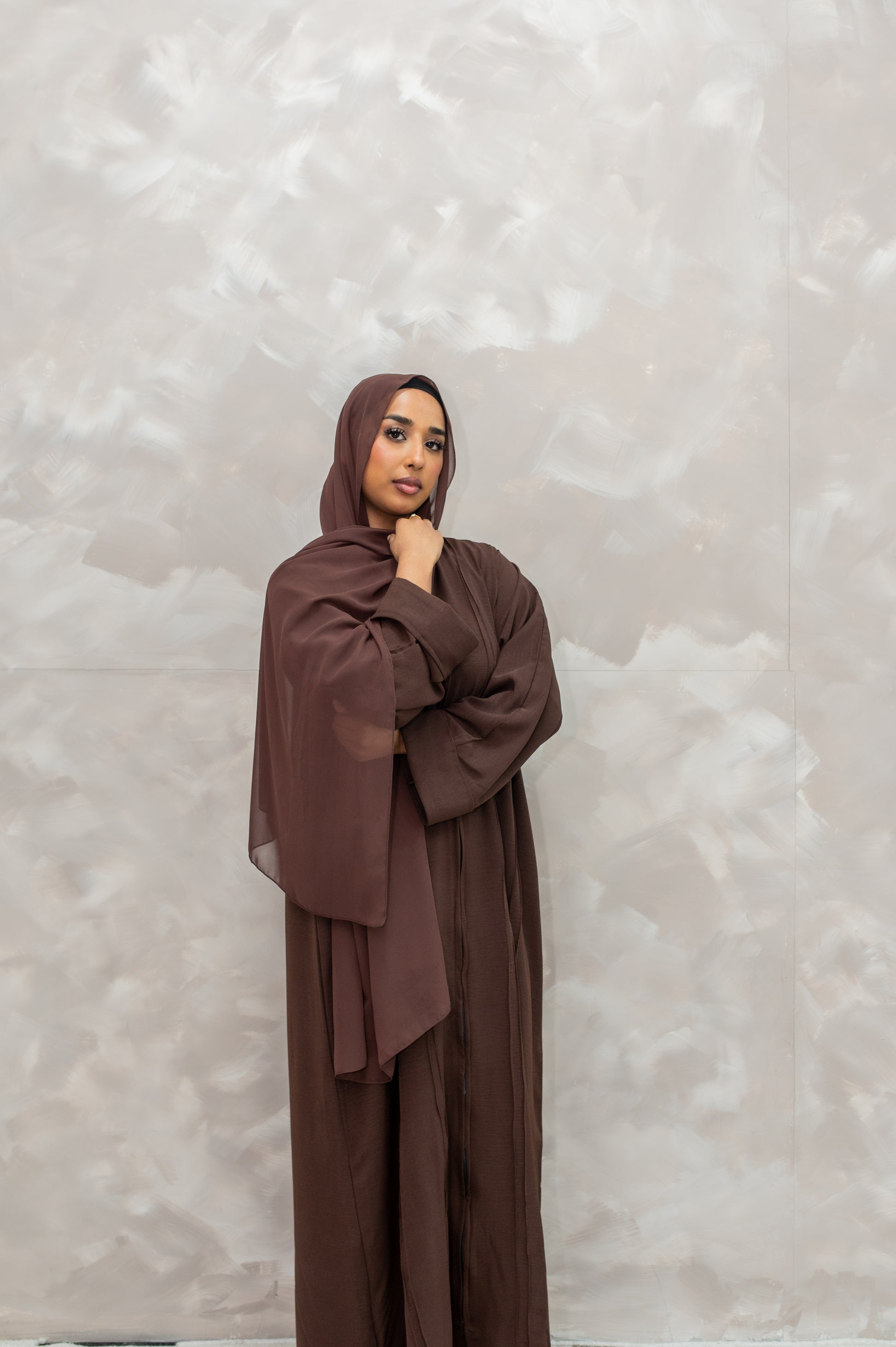 The Myra Abaya is crafted from premium cey fabric, offering a soft, breathable, and comfortable fit. It features a practical front zip closure for ease of wear while maintaining an elegant silhouette. Paired with a matching chiffon hijab, it exudes simplicity and grace, making it ideal for both casual and formal occasions.