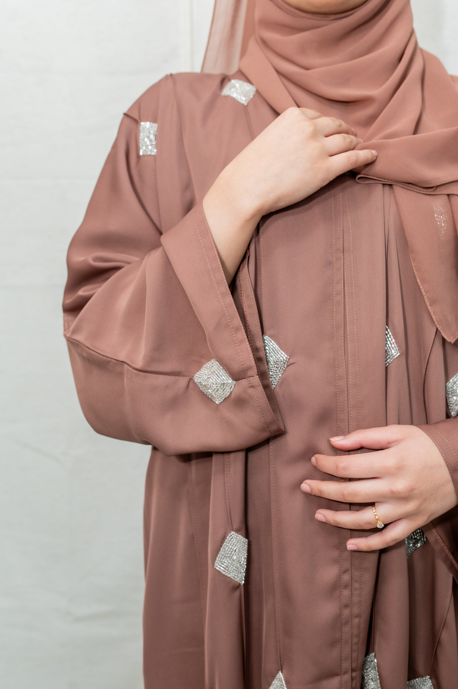 The Safa Abaya – a timeless blend of elegance and sophistication. This stunning piece features a rich mocha hue, perfectly complemented by delicate silver embellishments that add a touch of understated glamour. Designed with comfort in mind, the flowy silhouette allows for effortless movement, while the intricate detailing ensures you’ll stand out at any occasion. Whether it’s for an evening event or a casual gathering, the Safa Abaya offers versatility and style. Perfectly paired with a matching hijab, it’s the epitome of modern modest fashion.